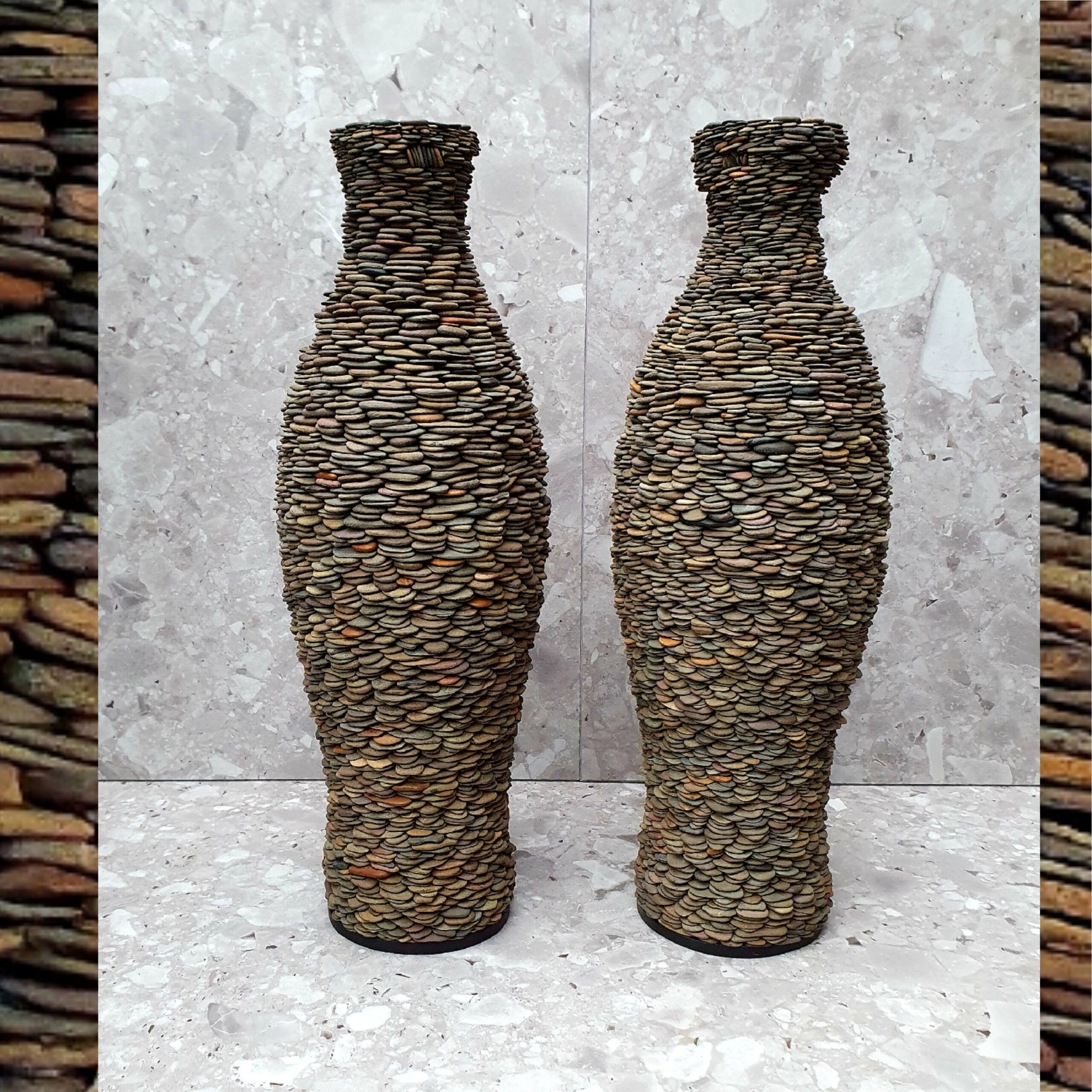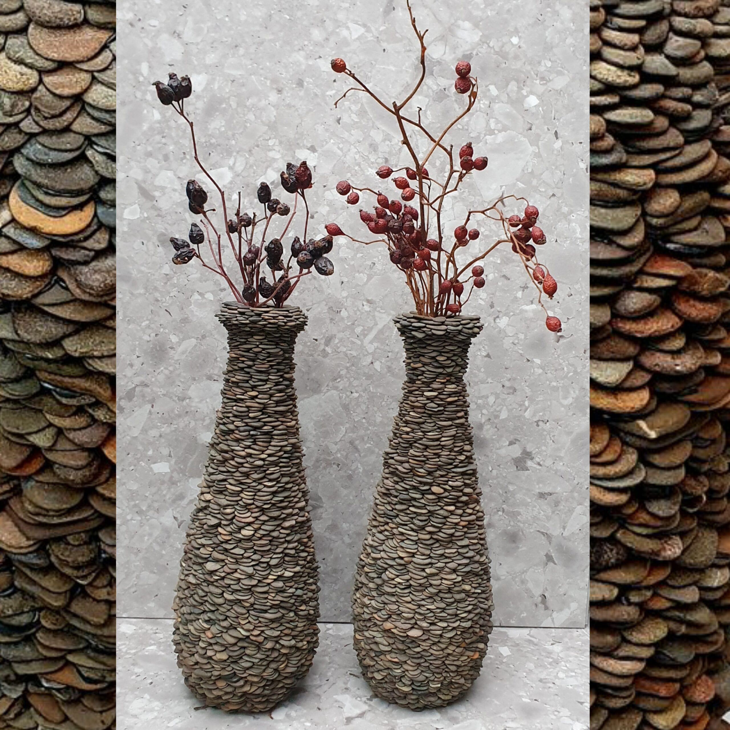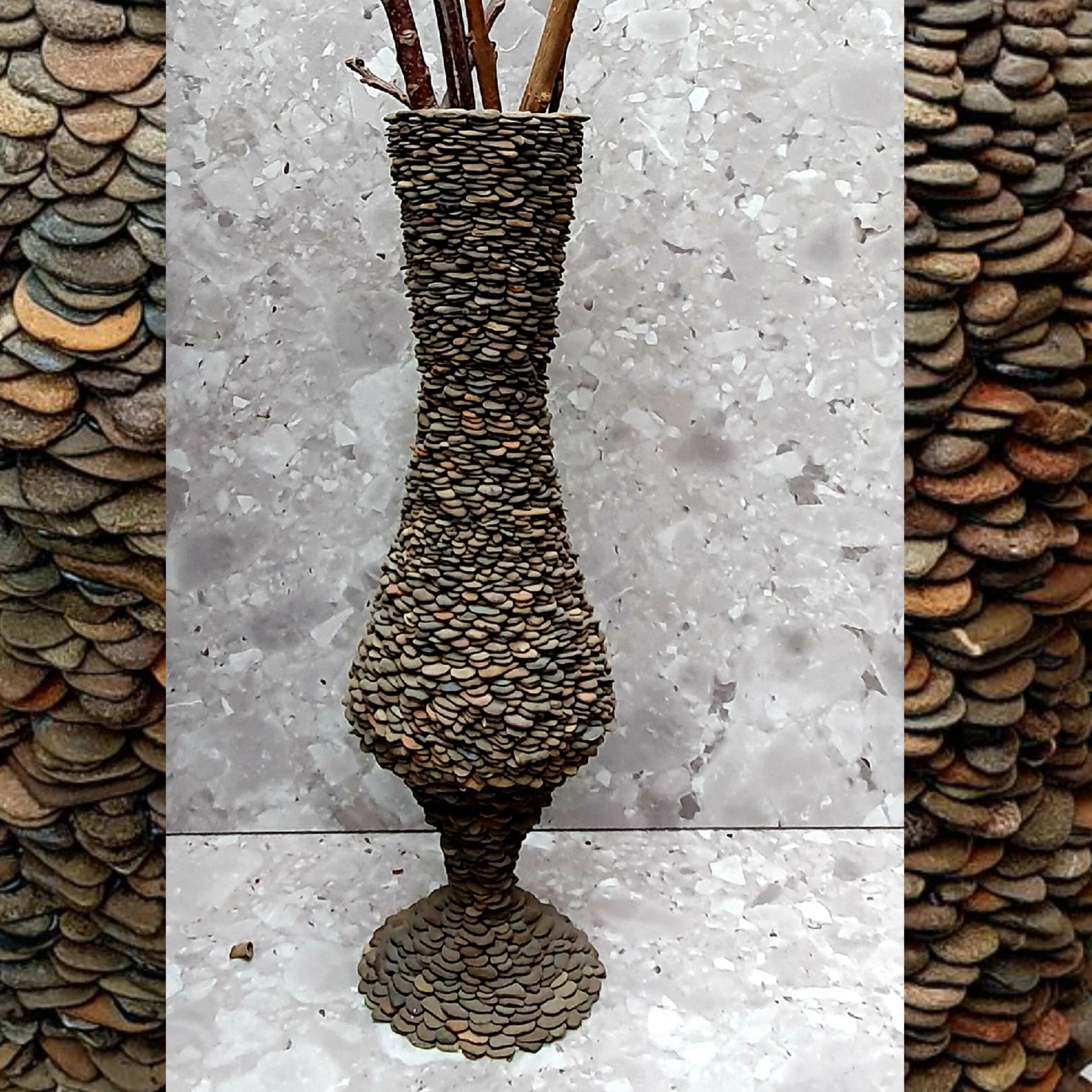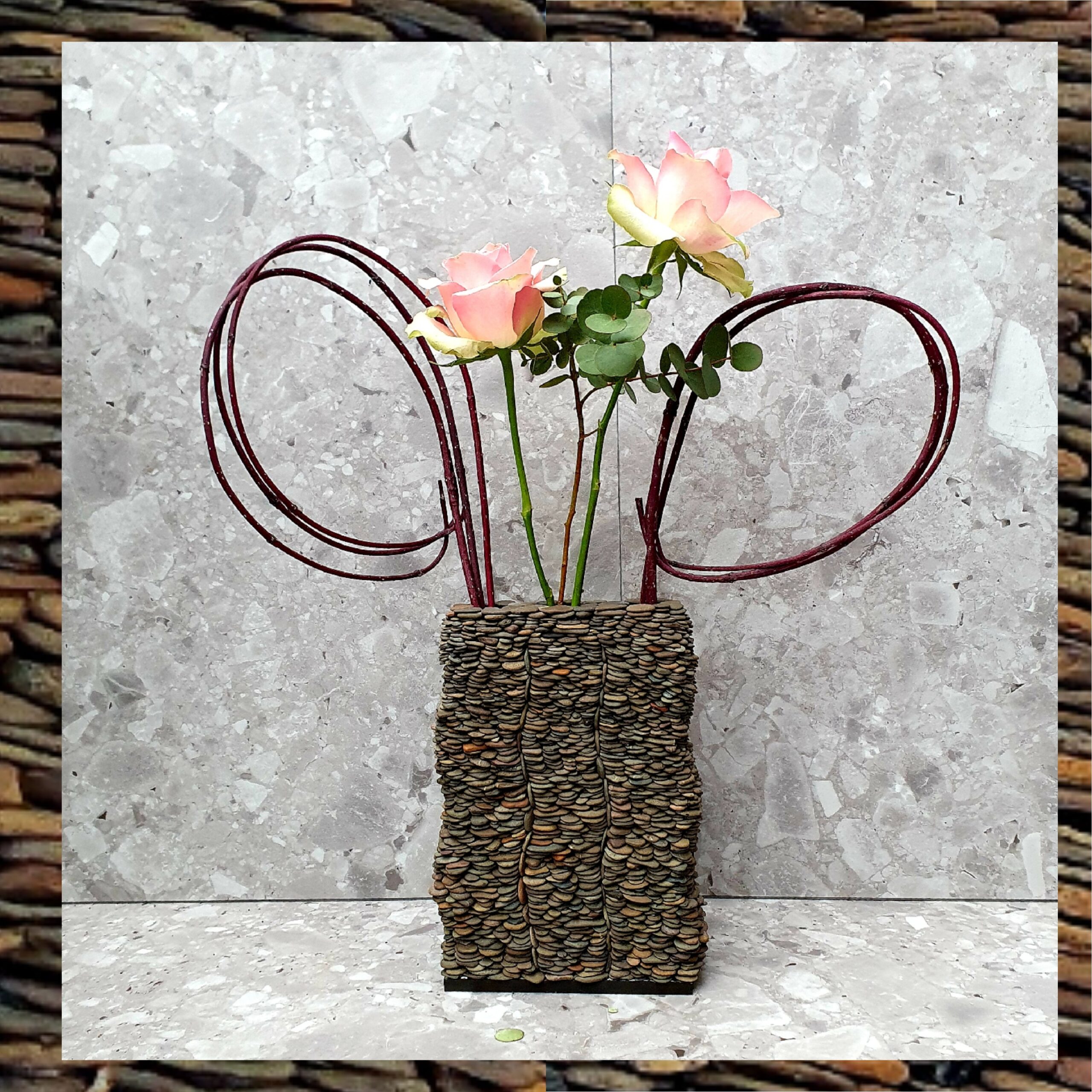 Mijn doel is jou te verbluffen met deze natuurstenen kunstwerken die opgebouwd zijn uit honderden, duizenden kleine platte riviersteentjes. Steentjes die ook een reis maakten, die geslepen zijn door water, zand en tijd. Deze steentjes zijn eerst verzameld langs de rivier (Waal), daarna uitgezocht, op maat gesorteerd om daarna uiteindelijk één voor één geplakt op een ander decor. Ik begrijp nu veel beter de begrippen engelengeduld en monnikenwerk. Maar het is fantastisch om langzaam een inspirerend kunstwerk onder je handen te zien verschijnen. De harmonie en rust van de natuur in optima forma. Kunst en natuur gaan hand in hand.