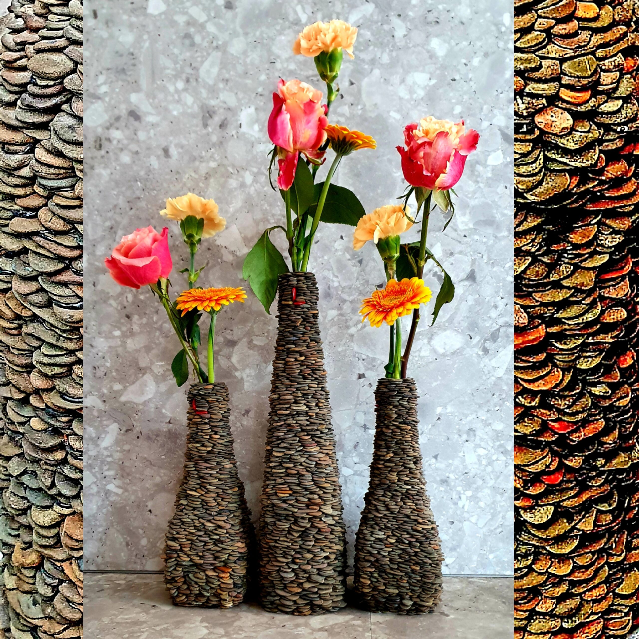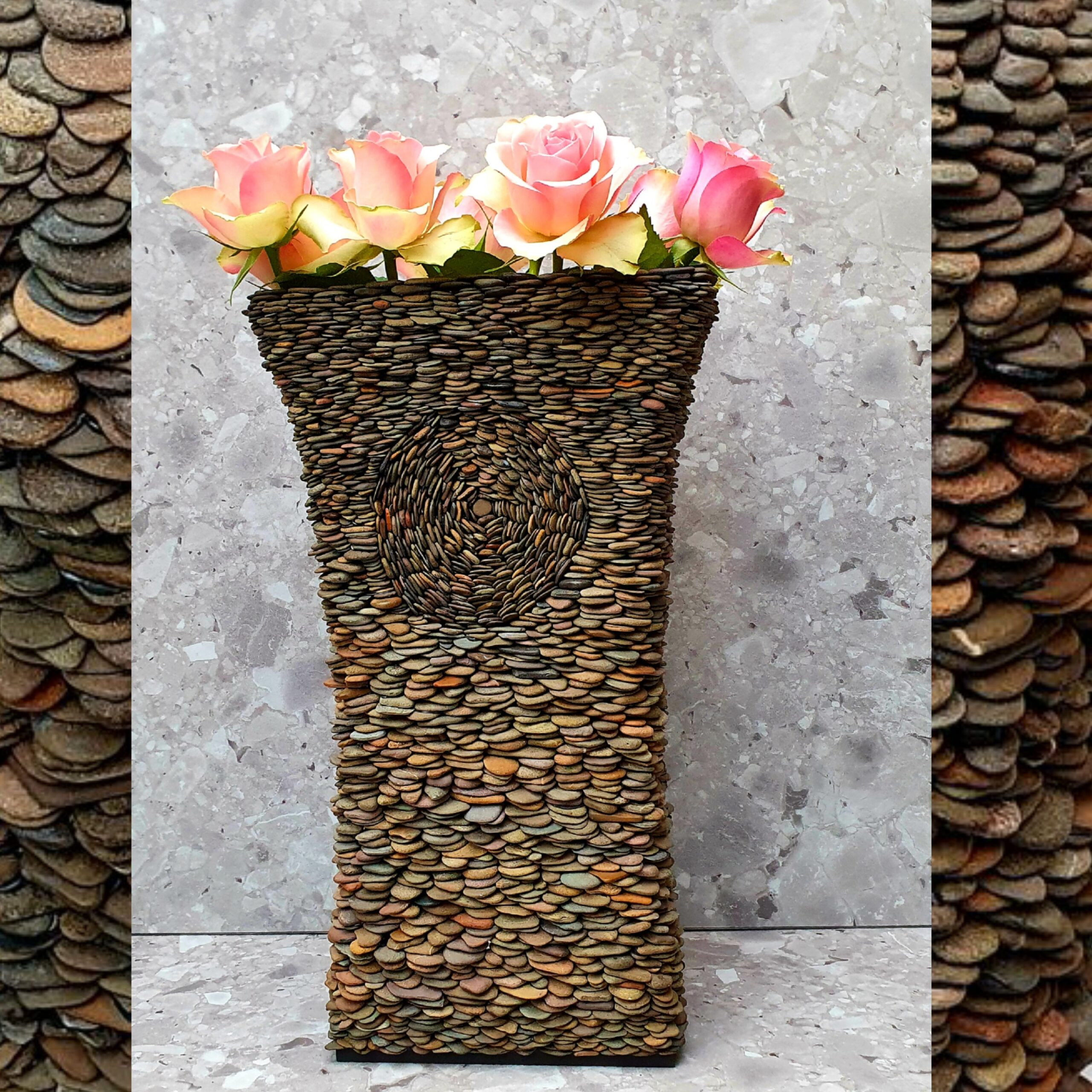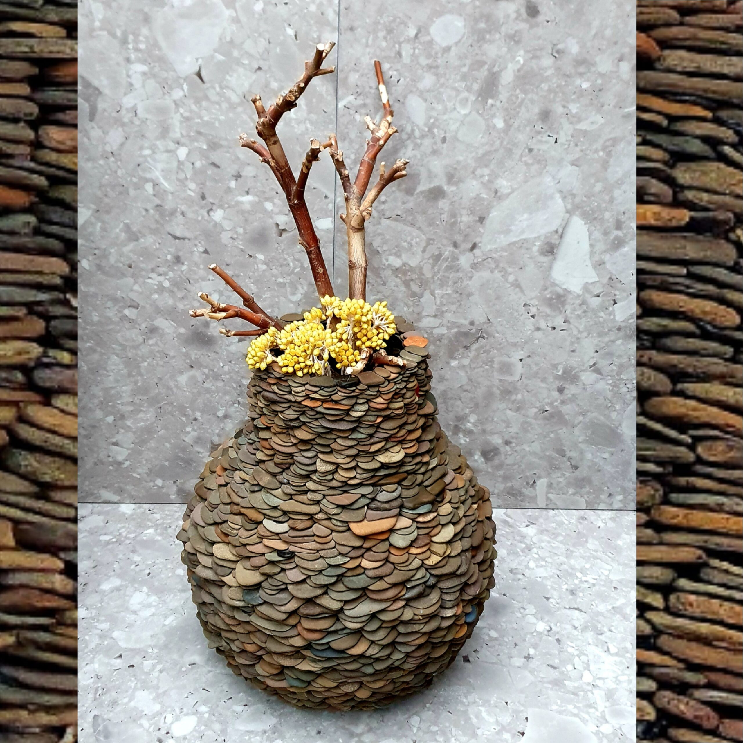 Mijn doel is jou te verbluffen met deze natuurstenen kunstwerken die opgebouwd zijn uit honderden, duizenden kleine platte riviersteentjes. Steentjes die ook een reis maakten, die geslepen zijn door water, zand en tijd. Deze steentjes zijn eerst verzameld langs de rivier (Waal), daarna uitgezocht, op maat gesorteerd om daarna uiteindelijk één voor één geplakt op een ander decor. Ik begrijp nu veel beter de begrippen engelengeduld en monnikenwerk. Maar het is fantastisch om langzaam een inspirerend kunstwerk onder je handen te zien verschijnen. De harmonie en rust van de natuur in optima forma. Kunst en natuur gaan hand in hand.